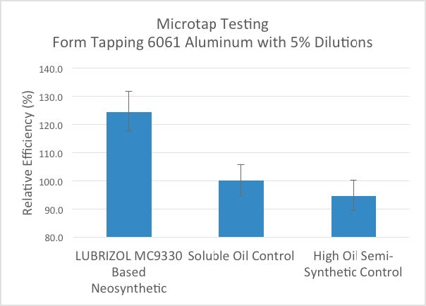 Figure 2 shows the Microtap performance for form tapping 1018 steel. The testing shows that the fluid based on Lubrizol MC9330 has a higher relative efficiency (better performance) compared to the soluble oil, and slightly lower versus the high oil semisynthetic. This is an impressive result considering there is no mineral oil in the neosynthetic. Figure 3 shows the Microtap performance on 6061 aluminum, and this testing shows a huge advantage for Lubrizol MC9330 on aluminum vs. the other two fluids tested.