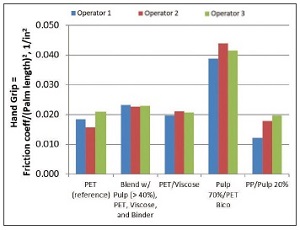 Figure 1b. The data of Figure 1a, where the friction coefficient has been divided by the square of the palm length of each operator, creating a new variable called hand grip. (Palm length is 3.80” for Operator 1, 3.70” for Operator 2 and 4.25” for Operator 3.) The two materials with at least 40% pulp have statistically higher hand grip versus PET and PET/viscose (synthetic/semisynthetic materials containing 0% natural pulp). Hand grip is significantly higher for the blend with >40% pulp versus either PET or PET/viscose, using t-test of values across evaluators at 90% confidence.