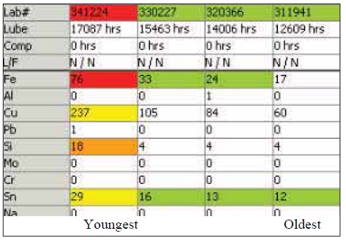 The full report of the most recent sample is shown in Figure 2 and represents the latest sample available for this component and, not surprisingly, the situation has worsened. Having disparaged single-digit wear metal growth above, I do like the Ni (nickel) value of 9 ppm as real, given the iron growth. Even the 4 ppm Ni, one sample prior, is potentially valid because Ni is one of several wear metals that rarely reaches double digits. Sn (tin) and Cu are accelerating, too, and the composite picture does not look good.