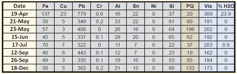 The most curious thing was the commentary. In all instances, except the first sample date, the statements “wear is normal” and “no further action required” were provided. The statement for the first date was modified to reflect “water is high” (also reflected in the July 17 results), “viscosity is high,” “wear is high” and finally “rusting noted.” The suggested action for the first date was “remove water and seal out further entry.” Otherwise, there was no suggested action step other than continue sampling.