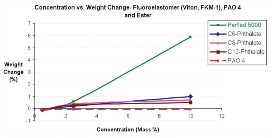 Figure 2. Concentration of Perfad 5000 in PAO 4 vs. weight change of Viton fluoroelastomer compared to phthalate esters.