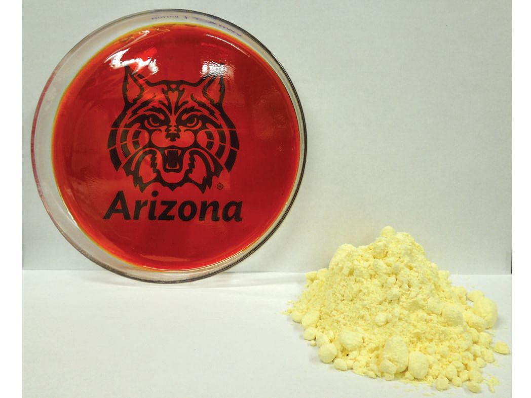 Figure 2. A new stable sulfur-based copolymer (shown in a petri dish on the upper left) prepared from sulfur (shown on the lower right) has the potential to be used as a more cost-effective material in batteries. (Courtesy of Jared Griebel/Pyun lab, University of Arizona - department of chemistry and biochemistry)