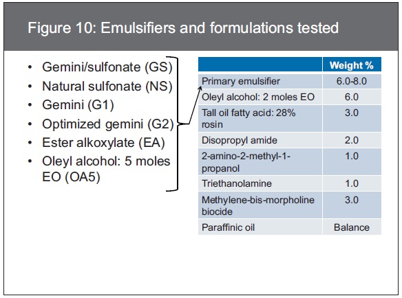 see Figure 10). These formulations were tested in emulsion form. The emulsions were examined by equilibrium and dynamic surface tension, as well as contact angle and particle size. Using these techniques, a metalworking coolant formulation can be understood well beyond a simple characterization of emulsion stability.