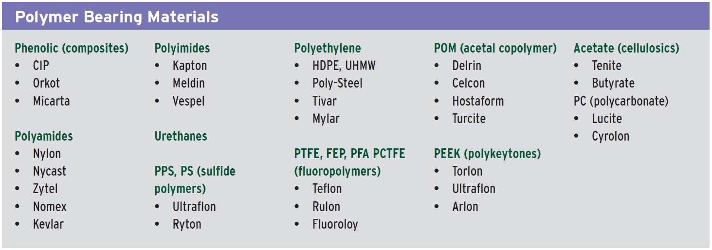 Many materials are used for plane bearings. Figure 5 shows a sample of the types of polymer materials used. Often manufacturers start with an inexpensive material and create good inexpensive bearings by adding friction modifiers such as Teflon or graphite to reduce friction and glass to increase stiffness. The same method can be used with expensive materials to make phenomenal bearings. “Secret sauces” are blends of the additives. When they’re added to simple polymer materials, they can create something that is very slippery.