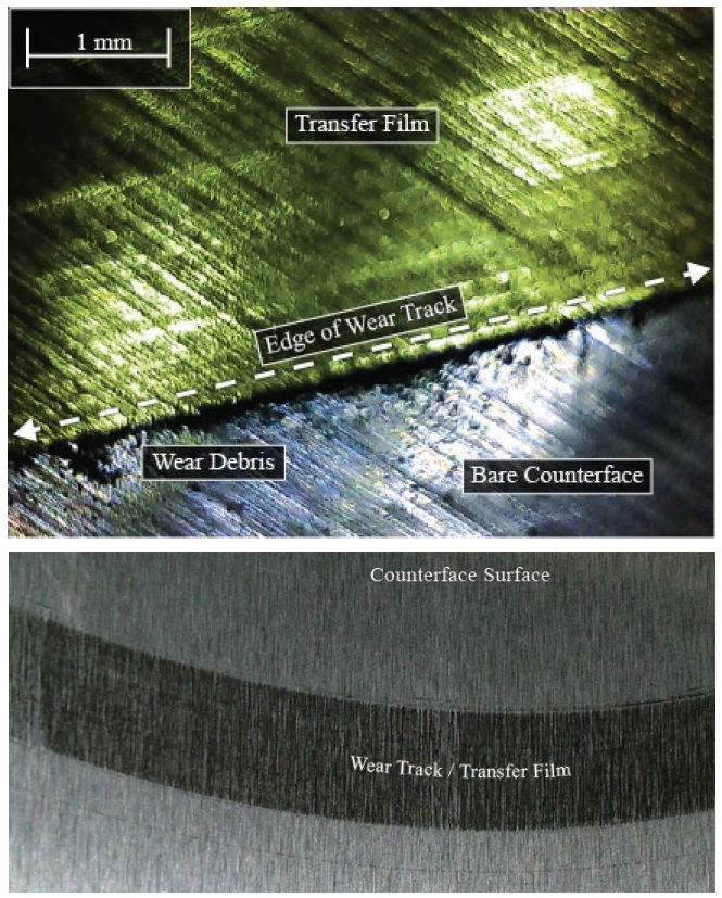 Figure 6. Teflon materials built up on the surface of a steel test disk and torn from the bearing make micro-thin coatings of the bearing material on the mating surface that can’t always be seen. They fill in the valleys in the surface. In this region there is low shear strength and high hardness, giving low friction. (Figure courtesy of Tribis Engineering.)