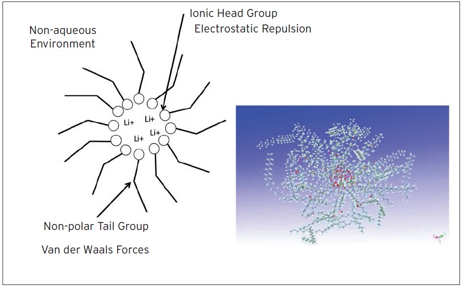 Figure 4. Reverse micelle concept. Since lubricants are non-polar environments, these micelles are reverse or inverse micelles. The non-polar tails face outward and the ionic head faces inward.