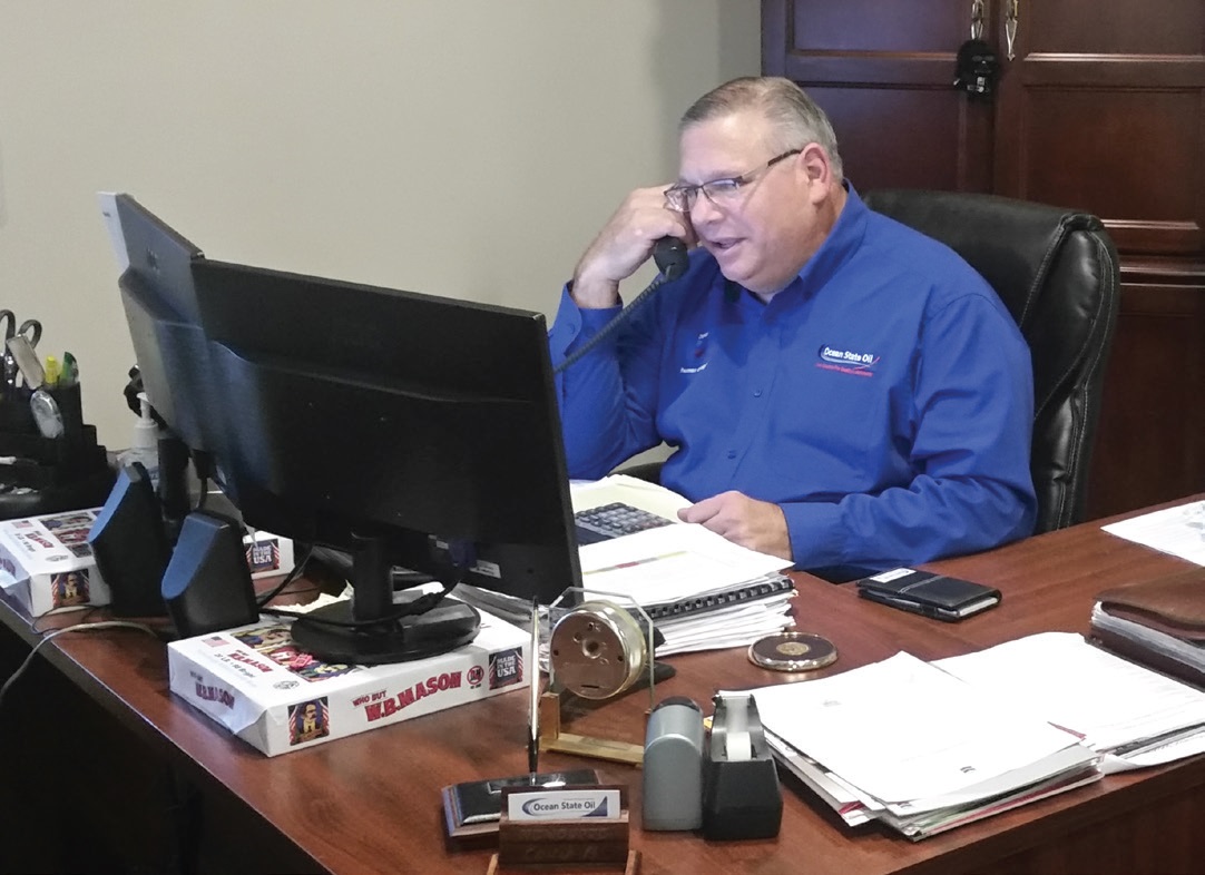 Louis Boschetti working at his desk for Ocean State Oil in North Kingstown, R.I.