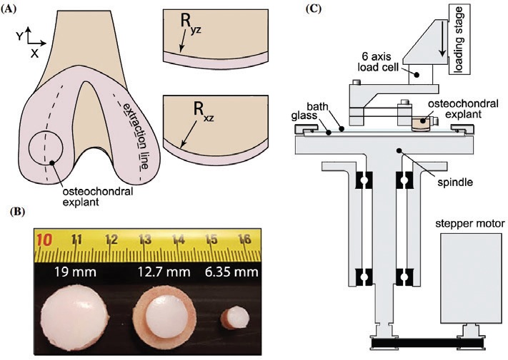 Figure 1. Cartilage samples were extracted from the central region of bovine femoral condyles (a), machined to size (b) and tested in a bath of buffer solution, with or without added hyaluronic acid on a rotary pin-on-disk tribometer (c). (Figure courtesy of Ref. 1.)