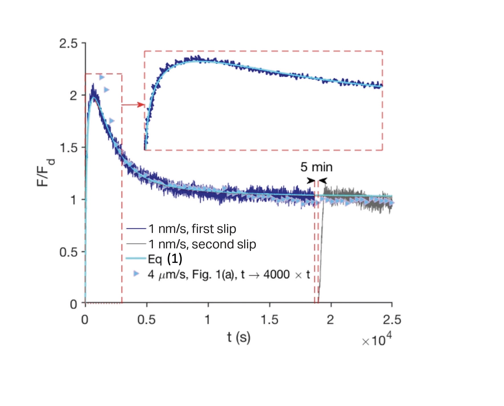 (from Figure 1) when both results are plotted as a function of distance. These results cannot be analyzed using conventional rate-state theory, and Drs. Bonn and Farain proposed that the behavior was the result of a competition between contact aging and rejuvenation; the evolution in friction force is given by