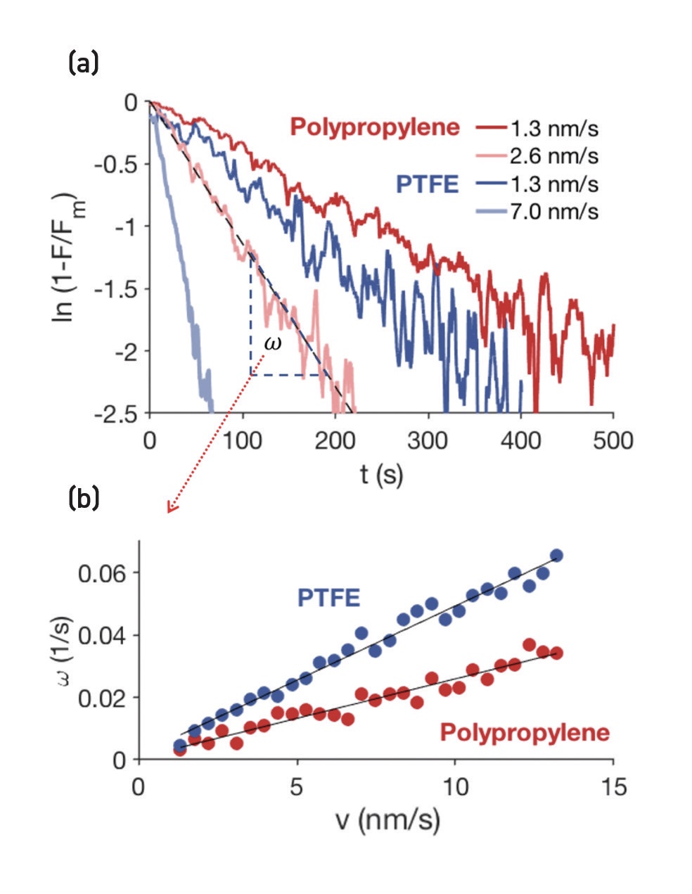 Figure 3. The increasing slow-sliding dynamics can be approximated by: ln(1-F/Fm )=ωt, with ω being proportional to v, and Fm is the maximum friction in agreement with Equation 1. Published with permission from Reference 2.