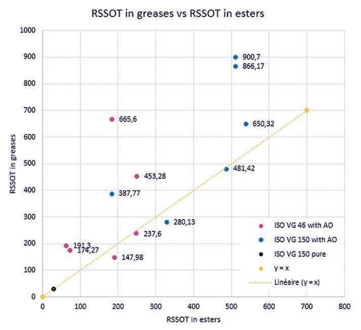 (figure 5) are interesting, since the RSSOT results of each AO combination in grease are close or mainly better than the combination in ester. The “ester model” could not give an exact result when used in the grease, but gives a very useful trend. (Oxygen diffusion, absorption speed, synergy effect with sulfonate, these options need to be studied).