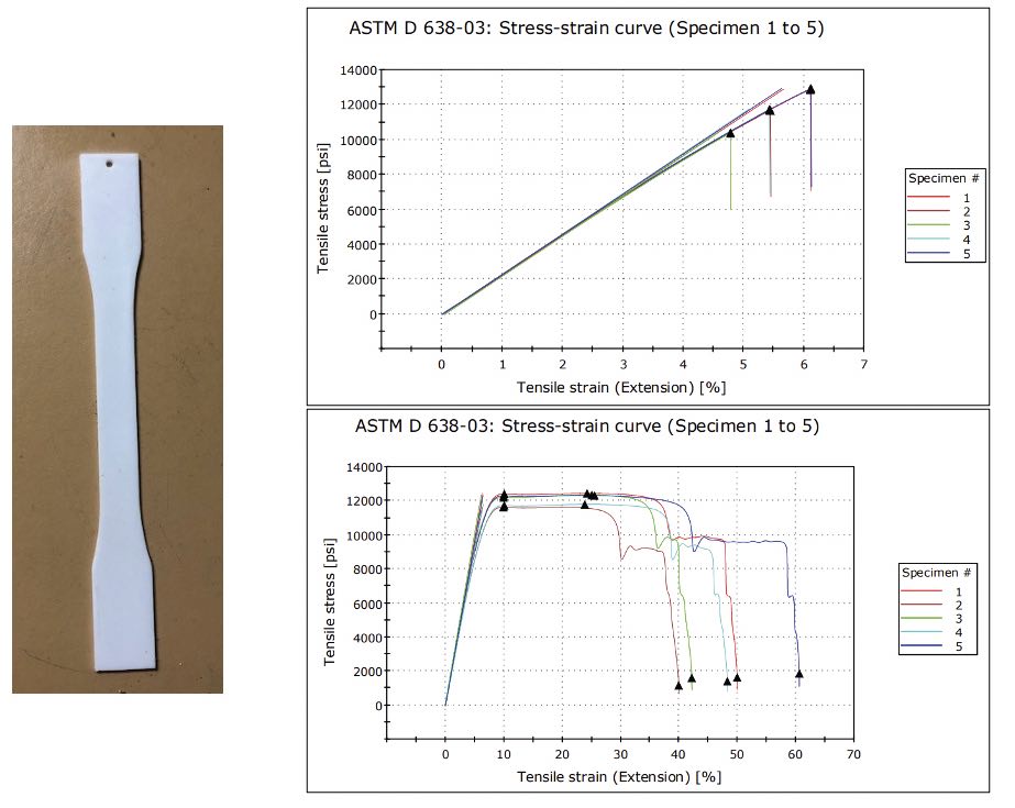 Figure 4. “Dog-bone” polymer sample (left) for ASTM D638 and two types of tensile failure (right). Figure courtesy of Southwest Research Institute.