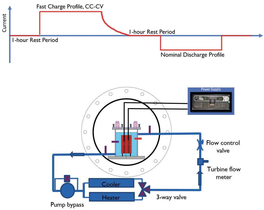 Figure 8. Battery performance and life testing charge/discharge profile (top) and test setup (bottom). Figure courtesy of Southwest Research Institute.