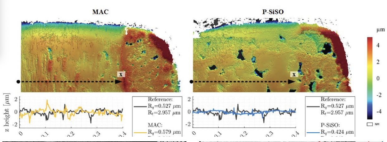 Figure 1. Surface roughness profiles were compared for gear tooth surfaces that had been run under a nitrogen atmosphere under lubricant-starved conditions. Multiply alkylated cyclopentane (MAC), a lubricant used in space applications, was used without (left) and with (right) a tribofilm-forming ionic liquid additive (P-SiSO). The MAC-only surface shows evidence of scuffing, while the P-SiSO surface shows smooth contact patches and retains the porous structure of the unworn sintered material. Figure courtesy of Reference 4.