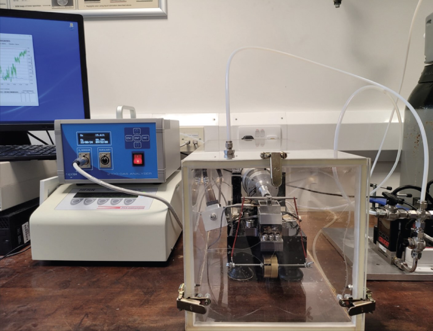 From the standpoint of adapting laboratory equipment, testing lubricants under nitrogen is easier than under hydrogen, ammonia or other flammable or corrosive gases. The Imperial College group tested samples using a high-frequency reciprocating tribometer enclosed in an airtight plexiglass box equipped with gas ports and an oxygen sensor, a modification that is commonly available for many test instruments