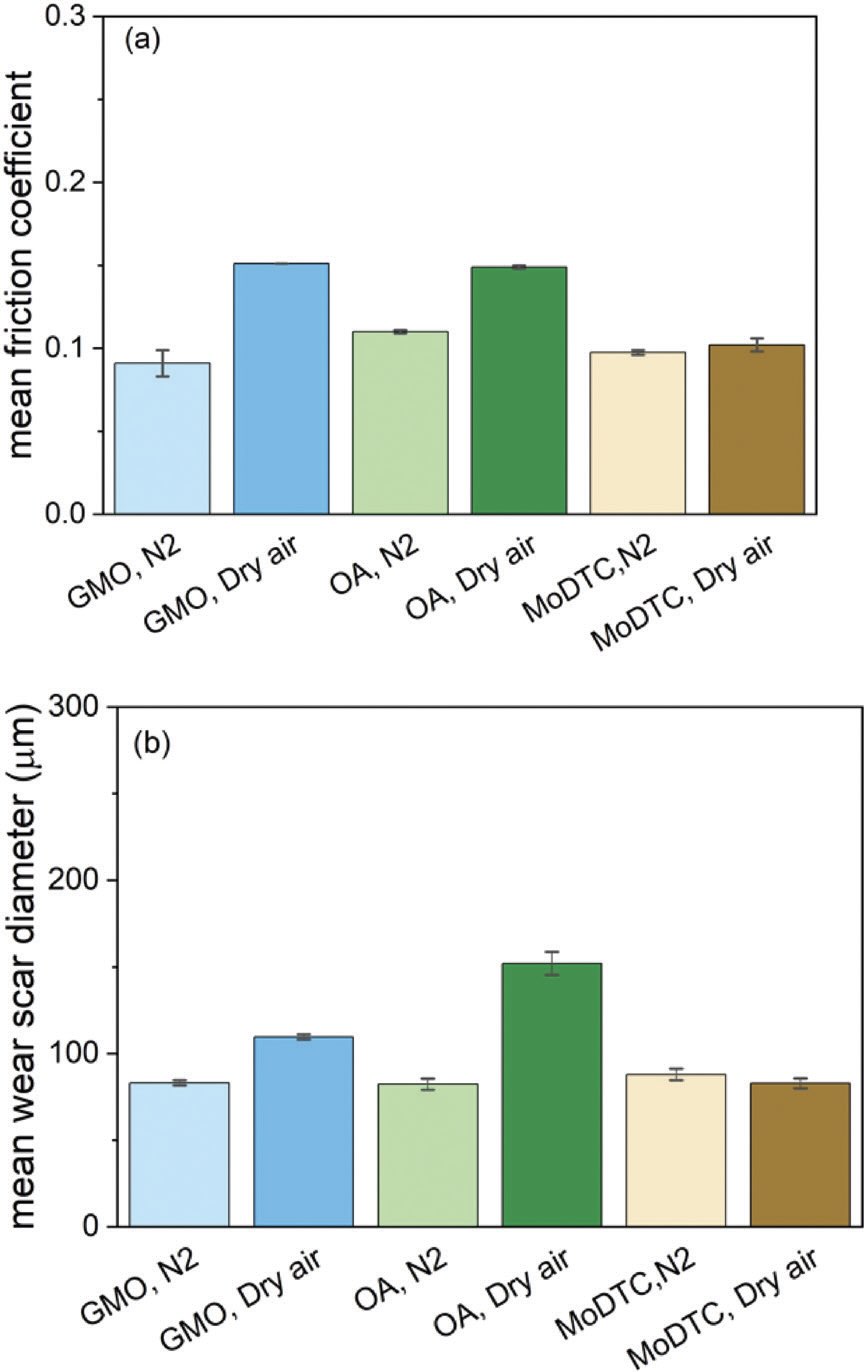 Figure 4. a.) Friction and b.) wear performance of two organic friction modifier additives (glycerol monooleate and oleylamide) and molybdenum dialkyldithiocarbamate in hexadecane at 60°C. Error bars show the range of the values. Figure courtesy of Reference 6, CC BY license.