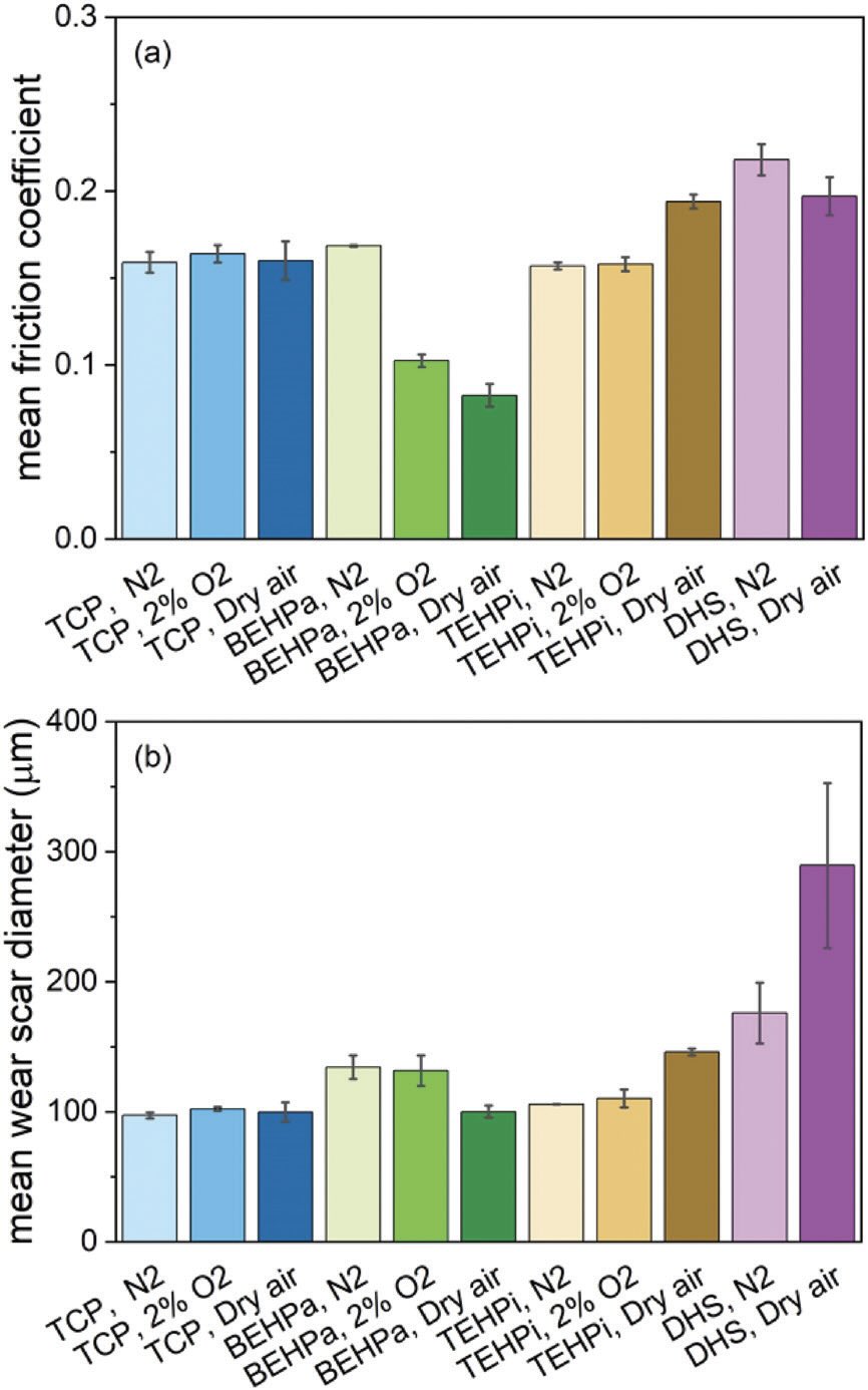 Figure 5. a.) Friction and b.) wear performance of model antiwear and extreme pressure (EP) additives. Error bars show the range of the values. TCP is tricresyl phosphate, BEHPa is bis(2-ethylhexyl)phosphate, TEHPi is tris(2-ethylhexyl) phosphite and DHS is dihexyldisulfide. Figure courtesy of Reference 6, CC BY license.