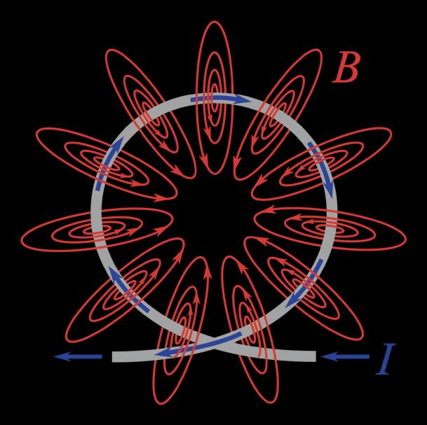 Permanent magnets are useful but not nearly as clever as electromagnets. Remember from the Maxwell equations that a current in a wire will cause a magnetic field. The "right-hand rule" teaches that our fingers show how the field wraps around the wire when a current flows in the direction of our thumb around the wire as shown in Figure 1. If the current flows through a loop of wire as in Figure 2, notice that all of the field lines inside the loop point downward (toward a North pole). A solenoid is a type of electromagnet made from a coiled wire that allows the magnetic fields of all the loops to point in the same direction. Applying Ampere’s law (the reference can provide the detailed calculation), the magnetic field inside the solenoid is proportional to the current and the number density (number of turns per unit length) of loops.5