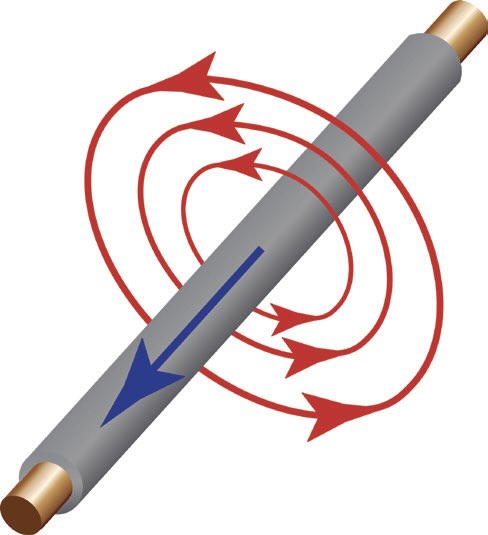 Figure 1. Magnetic field lines around a wire carrying a current. Figure adapted from User: Stannered, CC BY-SA 3.0, via Wikimedia Commons.