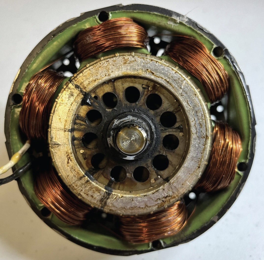There are two important takeaways from this equation. First, the magnetic field increases with every loop so that you get the same magnetic field from 100 loops of a 1 amp current or one loop of a 100 amp current. We’ve all been shocked with 5,000 volts of static electricity, but old electricians have been known to say “it’s not the voltage that kills you, it’s the current.”6 If a young electrician ignores this advice, they don’t get to be an old electrician. So electric devices like the motor shown in Figure 3 are much safer using dense coils of wire instead of higher current to maximize the magnetic field.