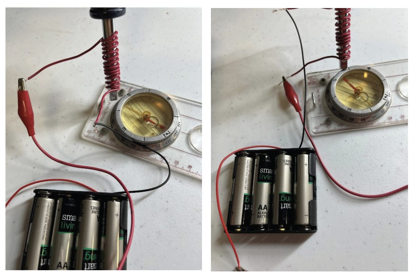 The second takeaway is that the magnetic field switches direction when the current is reversed as demonstrated with a simple experiment in Figure 4. The battery pack provides around 6 volts of DC current that flows from the red to the black lead wires (electrons flow black to red). When the red lead is attached to the top of the solenoid coil, current flows downward (clockwise as seen from the top) creating a North pole at the bottom of the coil. This attracts the South end of the compass needle because the Earth’s North magnetic pole is near the geographic South pole. When the red lead is attached to the bottom, the current and field directions are all reversed and the compass needle now points North. With all the conventions for North/South/positive/negative, it can be hard to remember which way is up. Scientists use different right-hand rules in electromagnetics, vector multiplication, torque rotation and stereochemistry to determine directions in three dimensions. I remember hearing that left-handed students had an advantage in physics because they could use the right-hand rule and write at the same time.