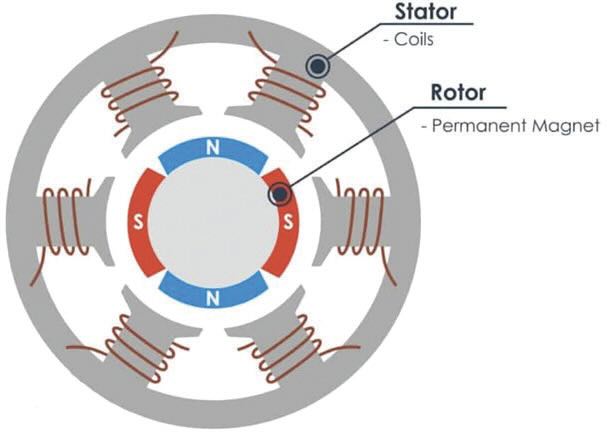 The key elements of an electric motor are shown in Figure 5. In this simple design, there are an even number of electromagnets in the stator (six in this diagram). They are wired so that the current paths of adjacent electromagnets are in the opposite direction so an electromagnet showing a North pole is always between two showing South poles. Permanent magnets are usually used in the rotor and again they alternate from North to South facing the stator. Although the stator is physically stationary, the fields are determined by the current which moves through the wires.