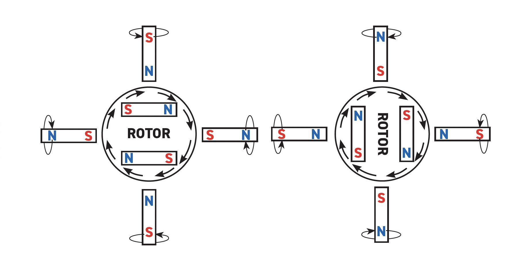 The left side of Figure 6 shows the magnetic orientation when the current is switched on. Of course, opposite poles attract and same poles are repelled, which pushes the rotor clockwise. But as the rotor arrives at its most stable (South up) position, the current reverses and flips the fields of the electromagnets. Now the stable position has moved ¼ turn clockwise and the rotor follows. Like a horse chasing a carrot on a stick, the rotor continues to rotate as long as the current reverses.