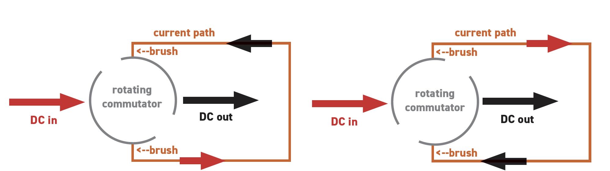 Direct current (DC) always flows in the same direction, so DC motors use different techniques to change the current flow as the rotor spins. One mechanical design uses brushes and a split ring commutator to switch the direction of the current. If the current enters from the left, it can be directed up or down depending on the position of the commutator as shown in Figure 7. Since the rotation causes the current to reverse, both must occur at the same rate, and the motor’s speed is determined by the electric energy input and load.