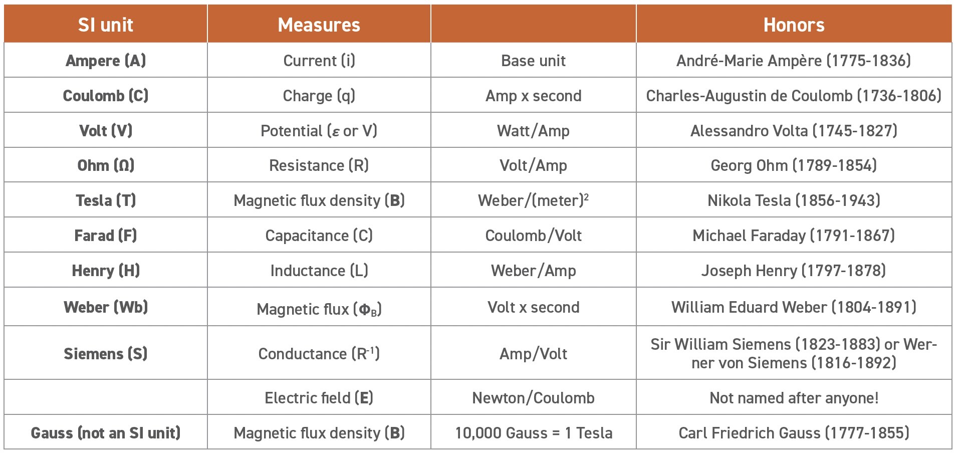 The International System of Units (SI) defines seven base units with exact values determined by international agreement. All other measurements are derived from these seven. The May TLT Lubrication Fundamentals article showed how meters (m), seconds (s) and kilograms (kg) are combined to measure critical tribological concepts such as motion, work, pressure, energy, viscosity and friction.8 Adding the Ampere (A or amp) expands the SI measurement system to cover electromagnetics as shown in Table 2.9 Although all of these measurements are derived from the base units, be forewarned that it is virtually impossible to think of the physical significance of combinations like [kg m2/A2 s3], which is better known as an Ohm.