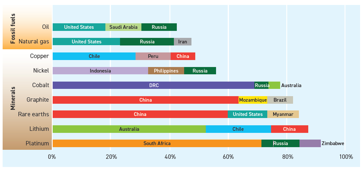 Figure 1. Top three countries of producing selected metals and fossil fuels in 2019.4