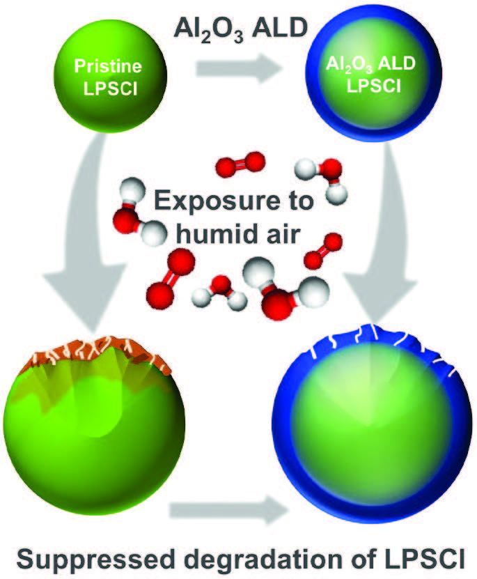 A schematic illustrates how the alumina coating reduces the degradation of LPSCl is in Figure 3.