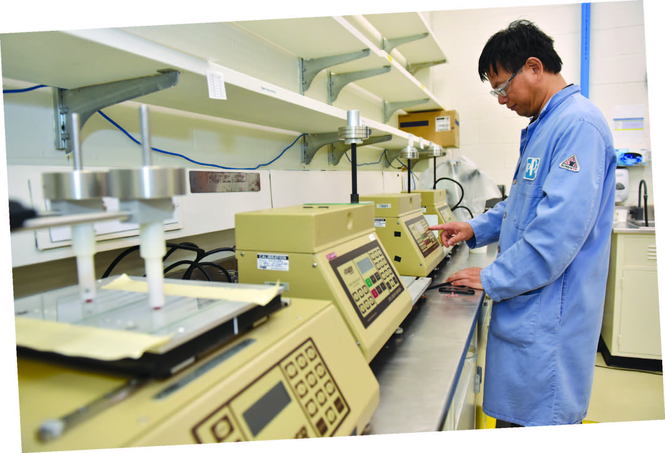 Dr. Songwei Lu conducted the linear scratch resistance test on easy-to-clean coatings in the laboratory in 2018.