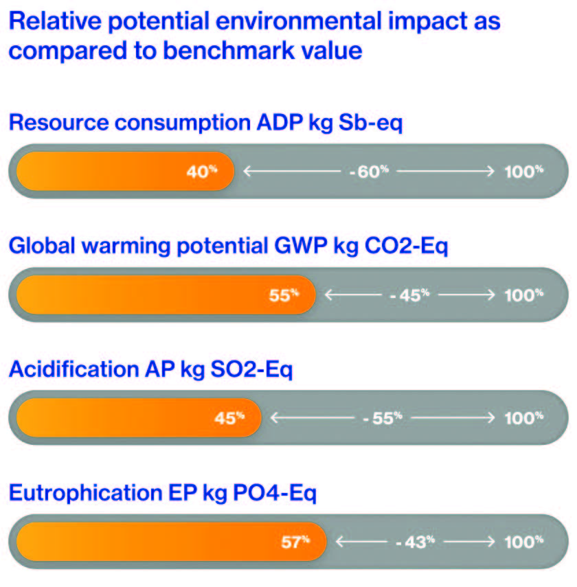 Figure 3. The ester-type base oils used in end-to-end compatible systems (orange) can reduce an operation’s environmental impact in comparison with a mineral oil-based benchmark coolant (gray). ADP is abiotic depletion potential, in kilogram antimony equivalent units (kg Sb-eq). GWP is global warming potential (kg carbon dioxide equivalent). AP is acidification potential (kg sulfur dioxide equivalent). EP is eutrophication potential (kg phosphate equivalent). Figure courtesy of Oemeta.