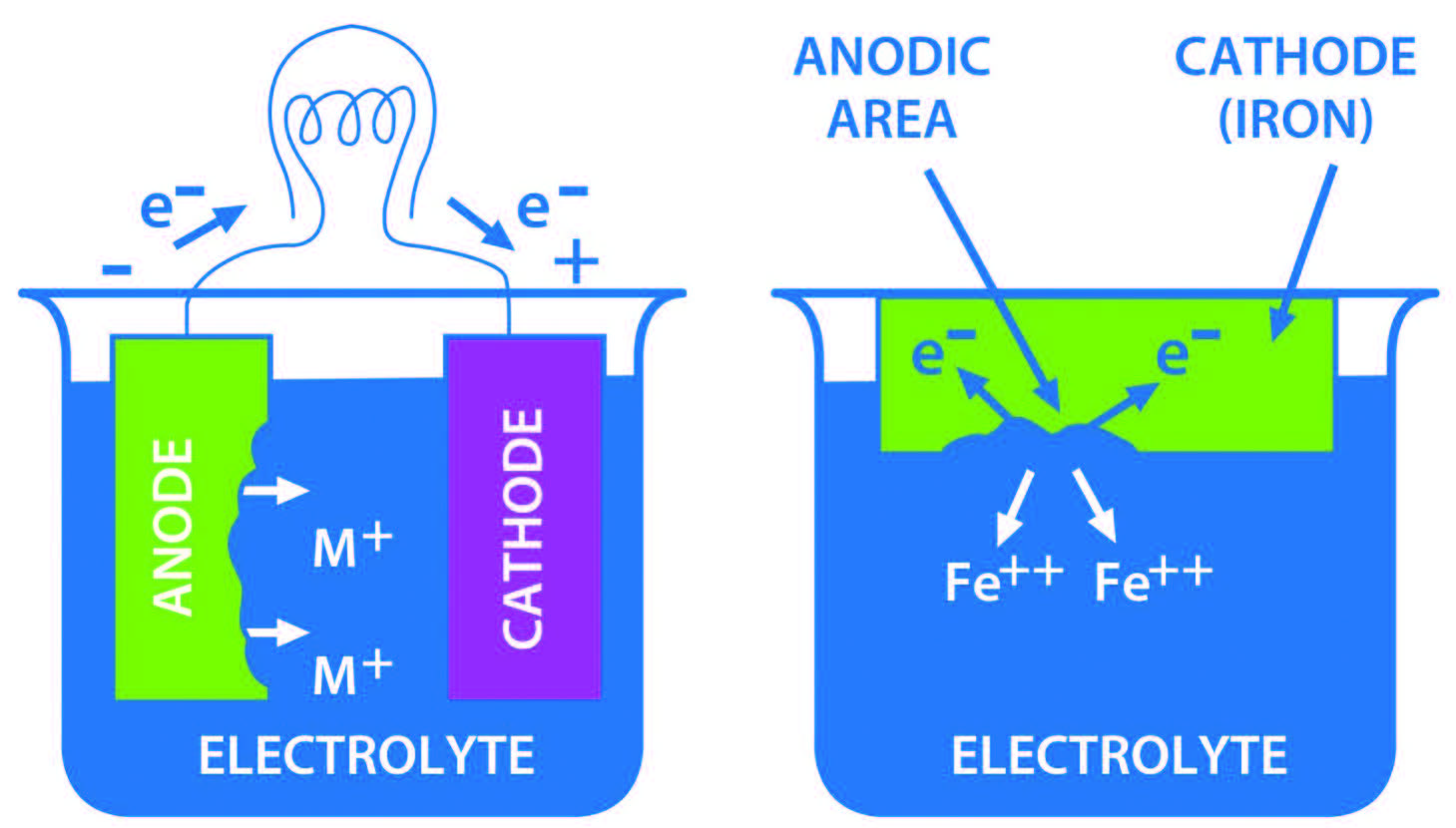 A wet piece of iron/steel has the same four essential elements as an electric cell. Iron is a conductor, cathode and anode. Its reactive sites form anodes in areas where the surface has imperfections. There are grain boundaries in alloys, there are temperature gradients, physical stress is present, and there is electrical polarization. In wet path/water, the electrolyte is present.