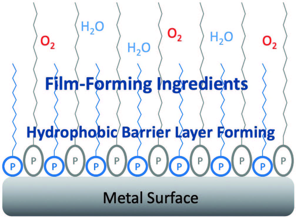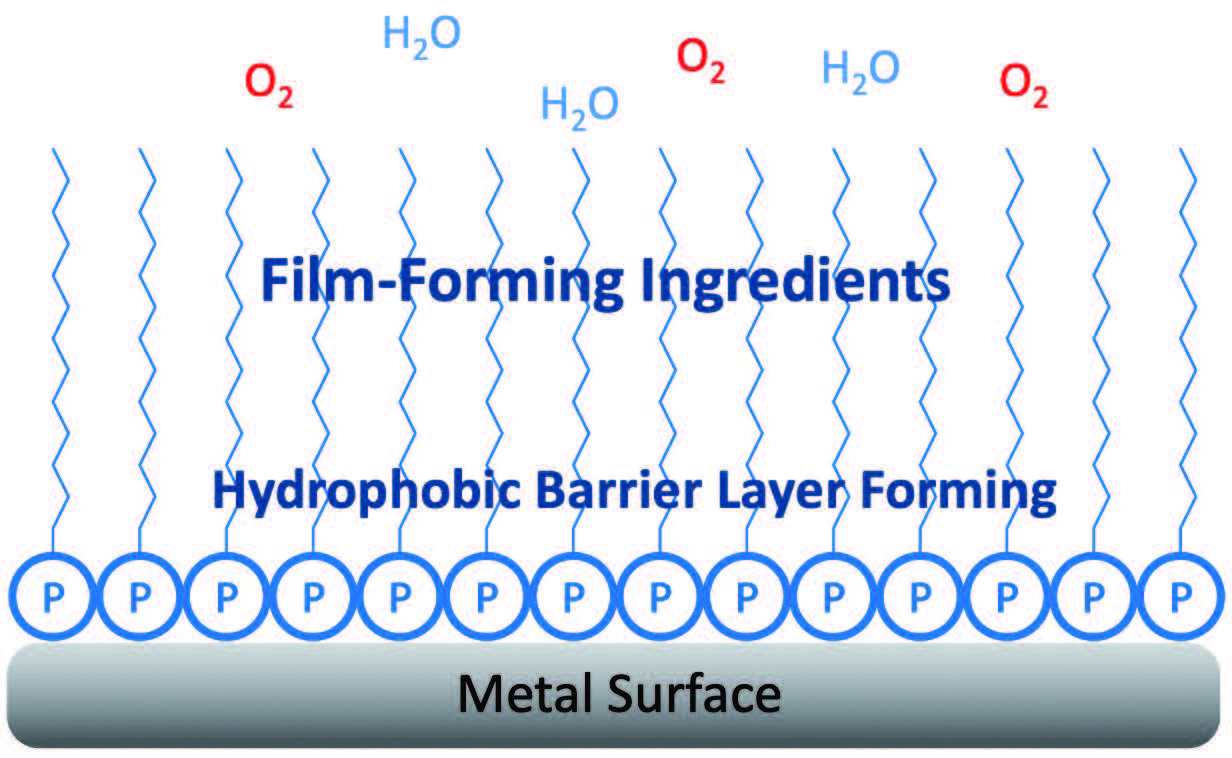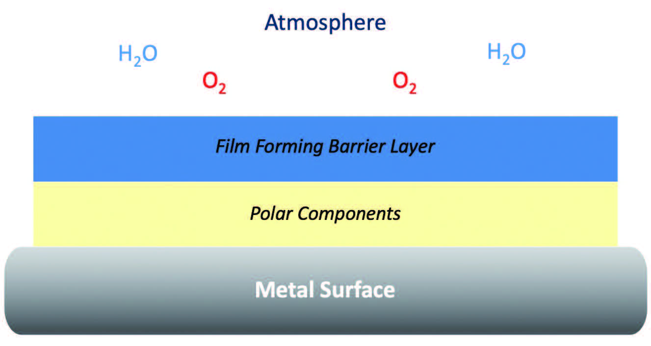 Figure 2 shows a typical representation of a RP film: On the bottom is the metal surface which is needed to be protected. Then there are polar components which align themselves with the metal surface; these also bring with them a film-forming barrier layer, and this serves to block oxygen and water from the atmosphere or the environmental conditions from contacting the metal surface breaking up those chemical pathways.