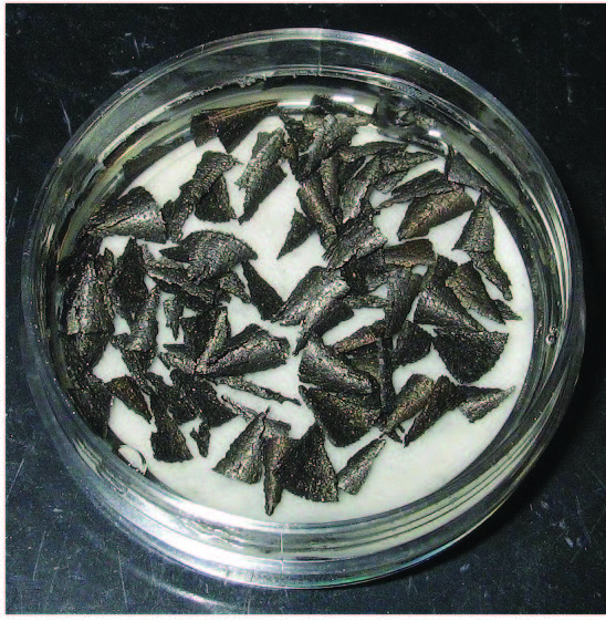 Figure 10 shows iron chips, from the iron chips test, ASTM D4627. This test method covers the evaluation of the ferrous corrosion control characteristics of water-dilutable metalworking fluids. In a disposable Petri dish, a piece of glass fiber filter paper is placed rough side up, then 5.0 mL of the diluted metalworking fluid and 4.0 grams of cast iron chips are added to the dish. The chips are fully submerged and evenly distributed. The dish is covered with its lid and allowed to stand for 20-24 hours at room temperature before draining the fluid and removing the chips. The filter paper is rinsed with running tap water for five seconds to remove any discoloration due to the fluid.