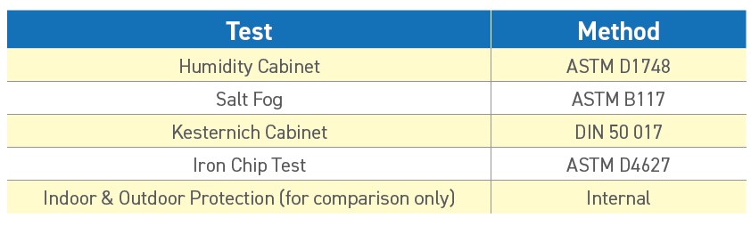 Salt fog – ASTM B117 is an accelerated method to differentiate rust prevention characteristics provided by a coating.
