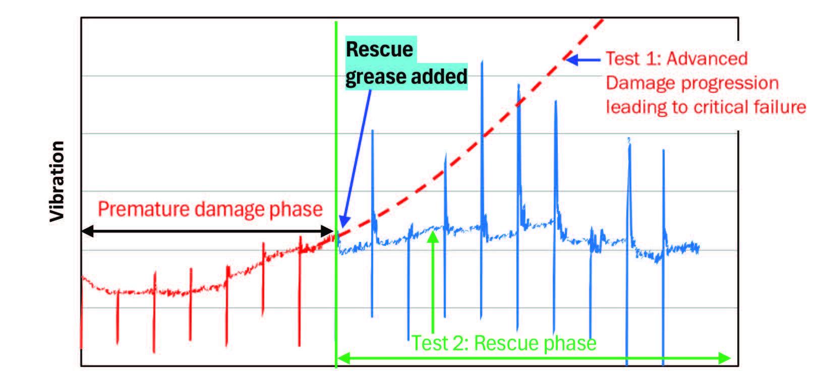 Figure 3. Vibration data from laboratory tests showing the benefits of rescue grease. Figure courtesy of Balasubramaniam Vengudusamy.