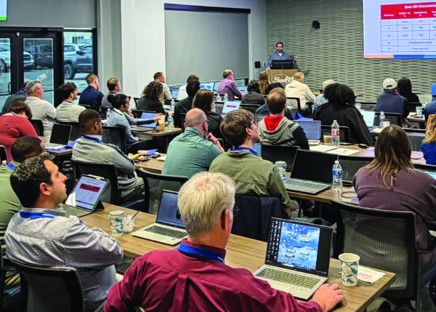 The final classroom session of day one was Lubricant Tests, presented by chair Raymond Drost from Calumet. The objective was to provide attendees with background information on test methods before they transitioned to the lab. Drost covered the purposes of specification tests, background on how standards get developed and examples of how test methods are structured. He then gave an overview of product data sheets before moving into specific tests. Both physical tests and performance tests were covered, with a focus on what each test is used for, when and why it might be needed, how results can be interpreted and the relevant standards. Before heading to the lab, Drost emphasized that testing is crucial for ensuring product quality, safety and reliability, and that standardized test methods and procedures ensure that results are consistent and reliable across labs.