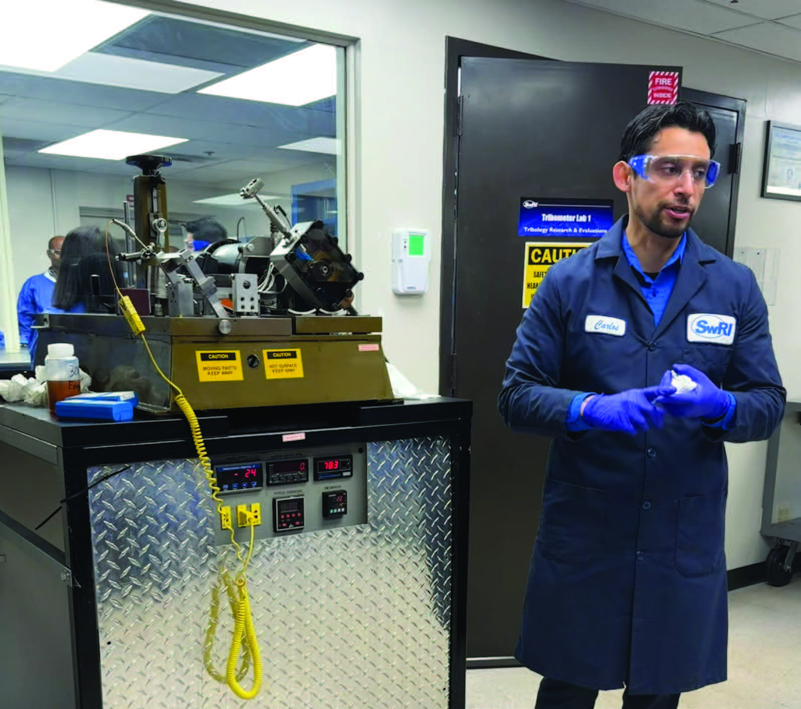Carlos Sanchez demonstrates a TE-77 reciprocating tribometer.