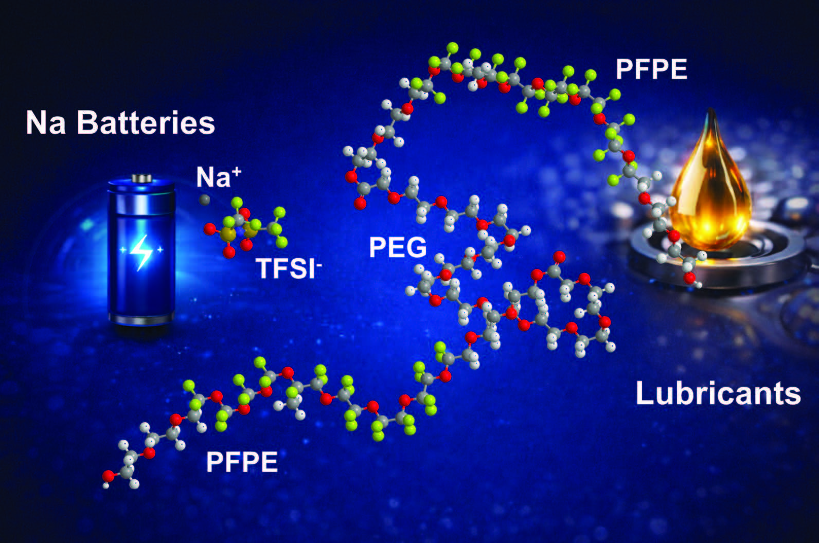 Figure 3. A polyester copolymer based on a polyethylene glycol (PEG) ester, perfluoropolyether (PFPE) and the dopant NaTFSI has potential for use as a sodium-ion battery solid electrolyte and in lubricants. Figure courtesy of the Medgar Evers College of the City University of New York.