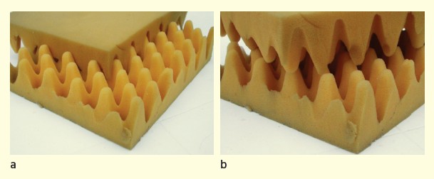 (see Figure 1a) results in strong resistance to relative motion between the pads, creating a high-friction situation. On the other hand, if one foam pad is rotated or displaced with respect to the other, such that the hills and valleys are not perfectly aligned, we have a structurally “incommensurate” state, and the pads can now slide with relative ease against each other, resulting in greatly reduced friction