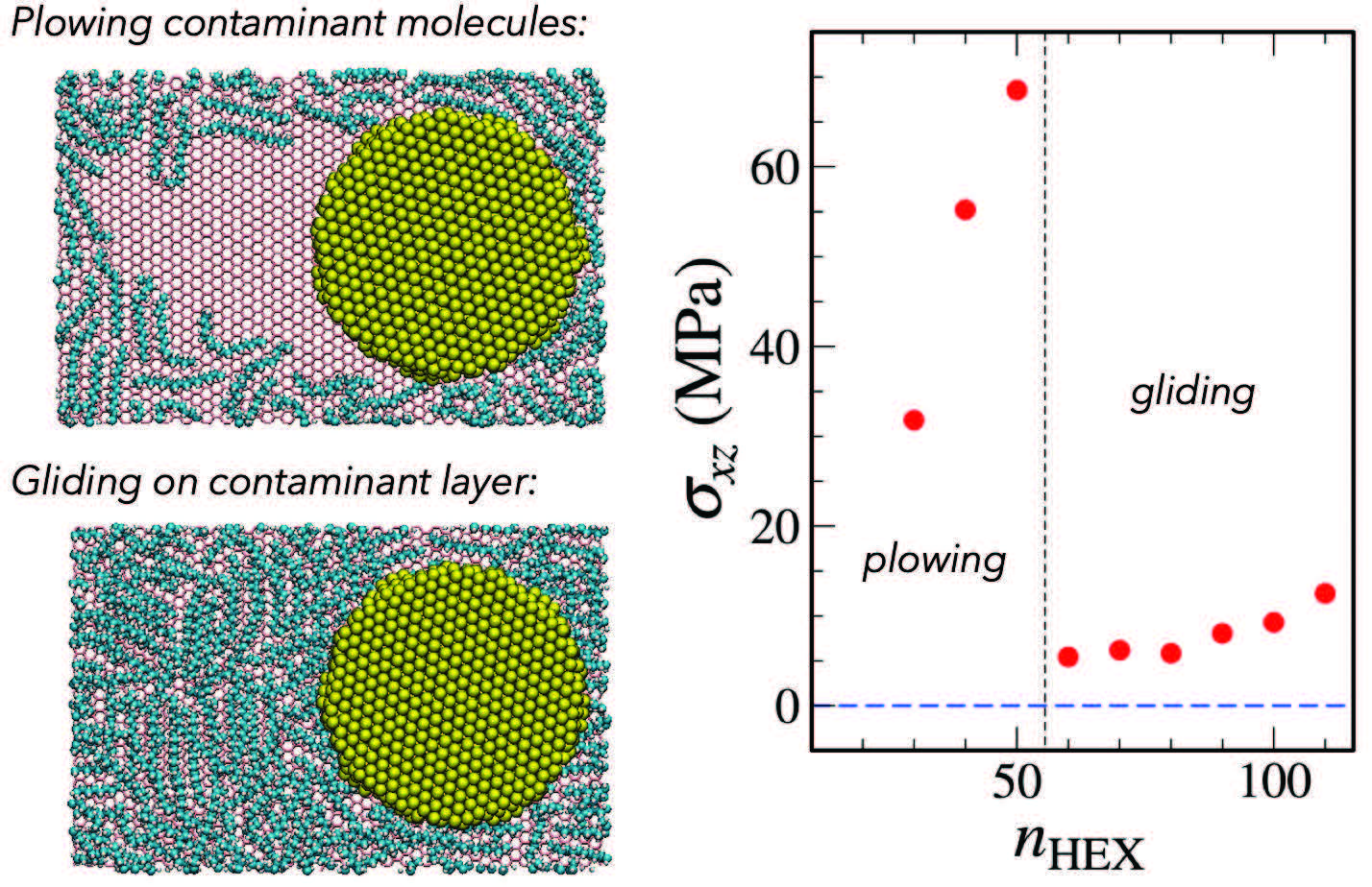 Figure 10. Molecular dynamics simulations indicate that nanoislands can plow through or glide on top of surface contamination layers, resulting in drastically different shear stress values and thus, friction. Figure courtesy of Ref. 6, CC BY-4.0.