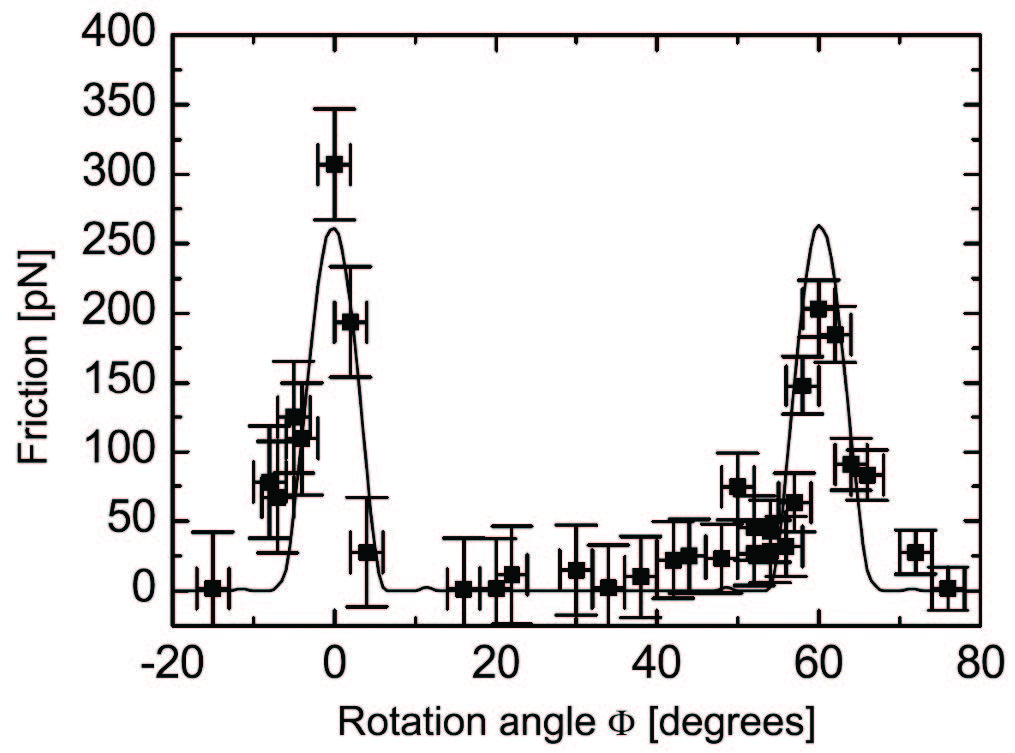 Figure 3. The first experimental results demonstrating structural superlubricity involved moving a graphite flake over a graphite substrate under dry nitrogen. Friction peaked at commensurate alignment angles between the two surfaces. Reprinted figure with permission from Dienwiebel, M., Verhoeven, G. S., Pradeep, N., Frenken, J. W. M., Heimberg, J. A. and Zandbergen, Henny W. (2004), “Superlubricity of graphite,” Physical Review Letters, 92 (12), 126101, https://doi.org/10.1103/PhysRevLett.92.126101. Copyright 2026 by the American Physical Society.