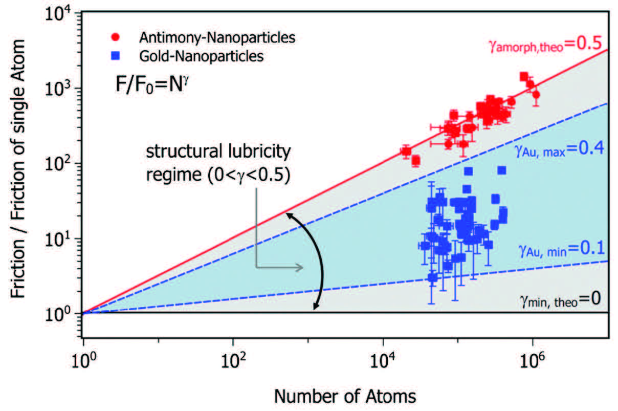 Figure 4. Nanoscale gold and antimony islands sliding over a graphite surface under ultrahigh vacuum exhibited a sub-linear relationship between normalized friction values and the number of atoms in contact. Reprinted figure with permission from Dietzel, D., Feldmann, M., Schwarz, U. D., Fuchs, H. and Schirmeisen. A. (2013), “Scaling laws of structural lubricity,” Physical Review Letters, 111 (23), 235502, https://doi.org/10.1103/PhysRevLett.111.235502. Copyright 2026 by the American Physical Society.