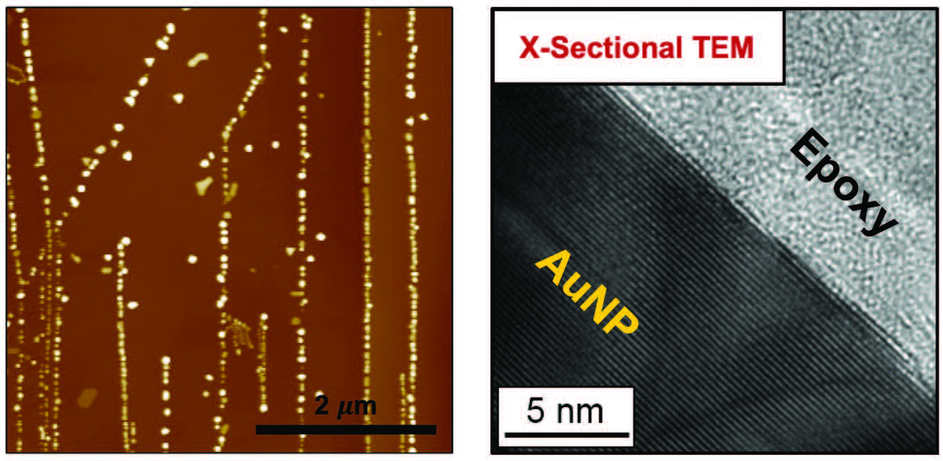 Figure 5. Left: Gold nanoislands thermally deposited on graphite under vacuum preferentially align along graphite step edges. Right: Transmission electron microscope image of the cross-section of a gold nanoparticle (nanoisland) marked AuNP. Figure courtesy of Ref. 6 (left) and Ref. 5 (right).