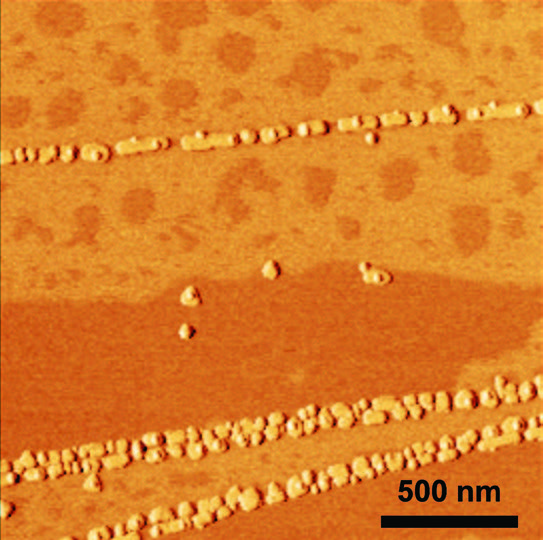 Like Dietzel and colleagues, Baykara’s group used gold nanoislands on a graphite substrate, but they performed experiments under ambient conditions. The gold islands were thermally deposited onto the graphite surfaces. Because the step edges of graphite are chemically very active, some gold islands tend to migrate there during synthesis or nucleate there during deposition